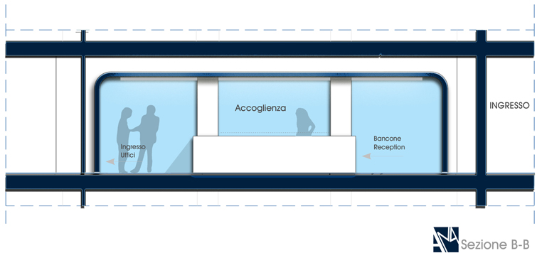 Analisi degli spazi, Analisi dell'immobile, Studio di fattibilità, Interior Design, Rendering, per l’allestimento dell' area Reception/Accoglienza della sede in Milano. |